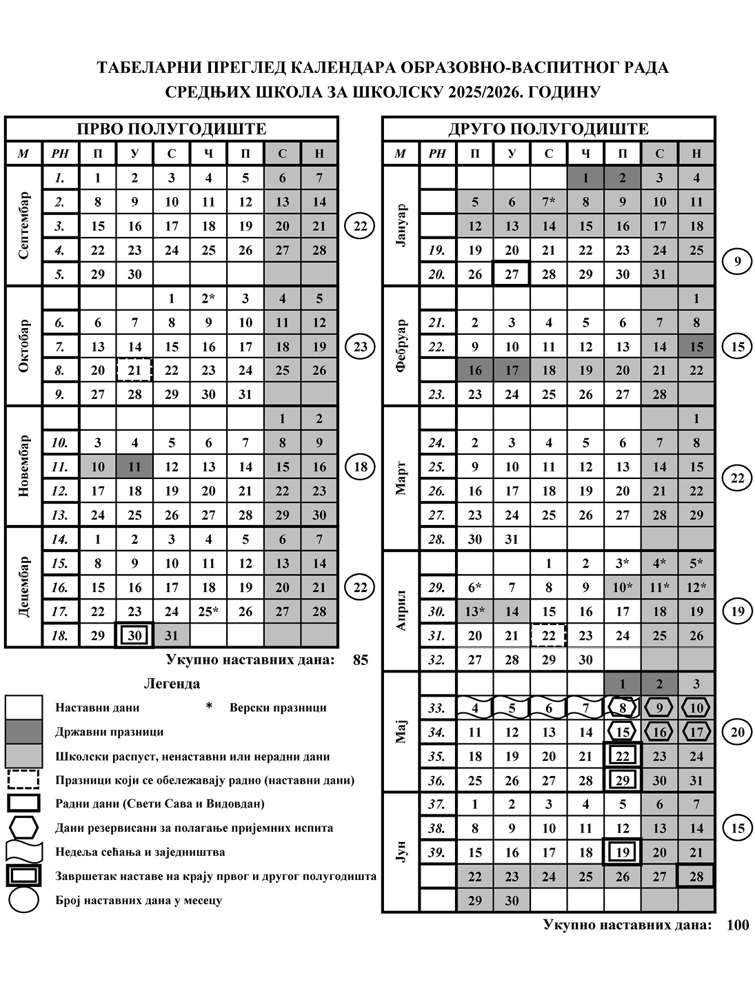 Завршетак наставе у школској 2024/25. години је у петак 20. јуна 2025. године. Часови у петак 20. јуна 2025. године биће скраћени на 30 минута.